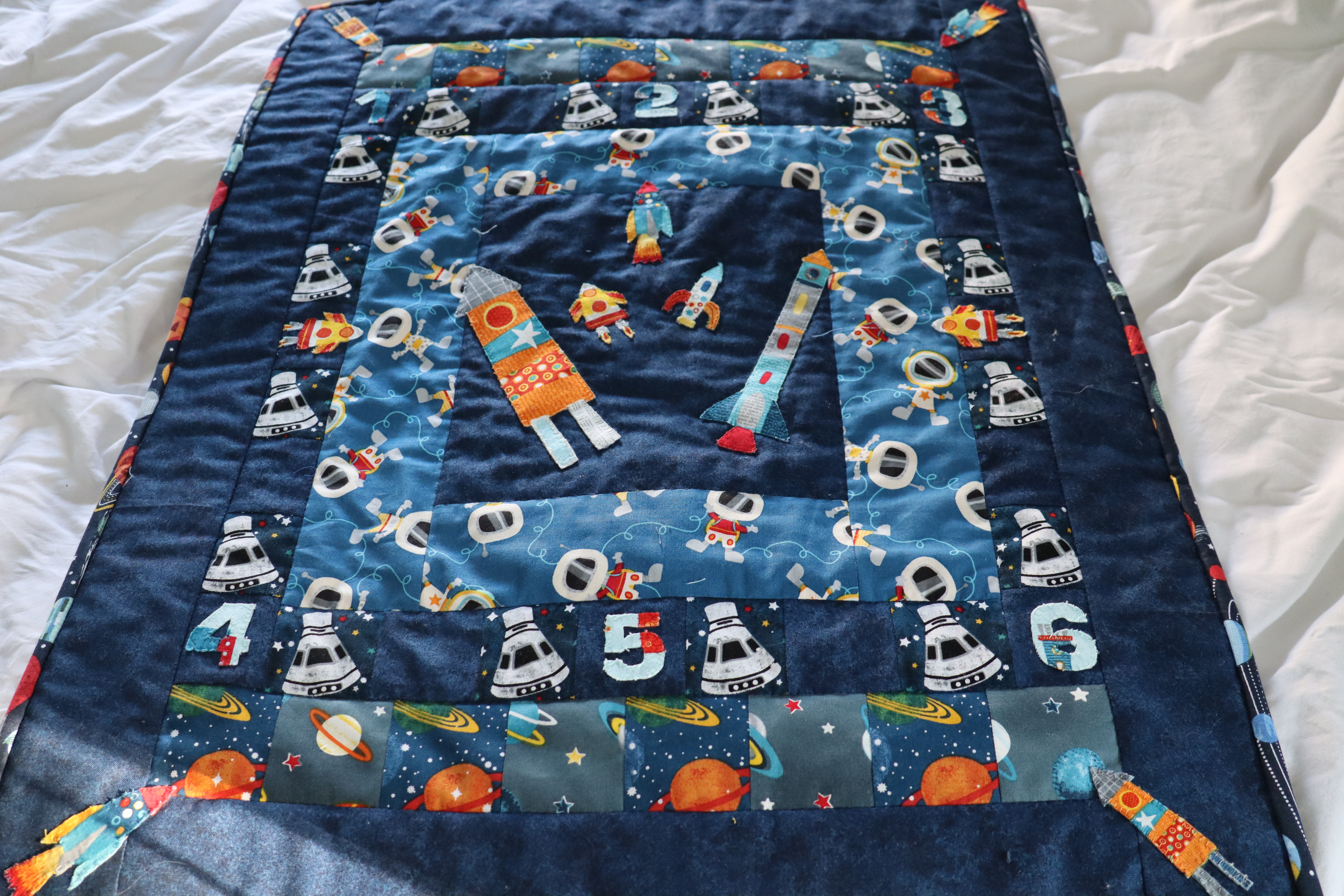 I made a bespoke space quilt for a friend and decided to make another one to sell on Etsy. I enjoyed designing and making it. It can be personalised by adding a name to the front of the quilt in material and sewn on.